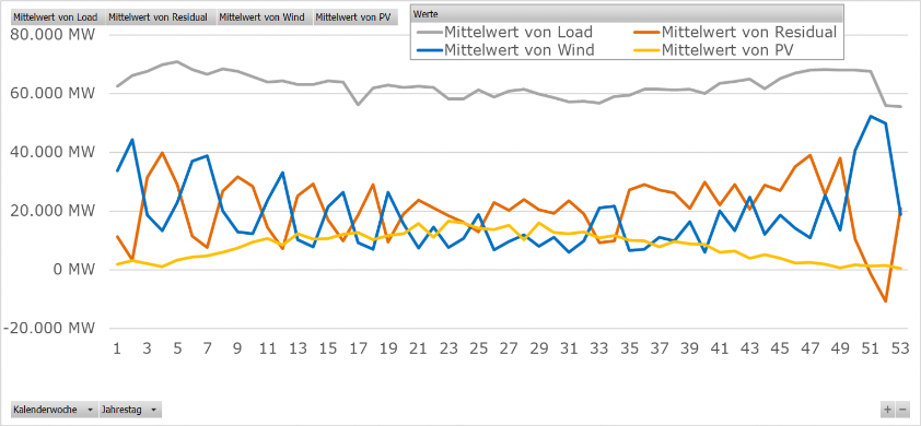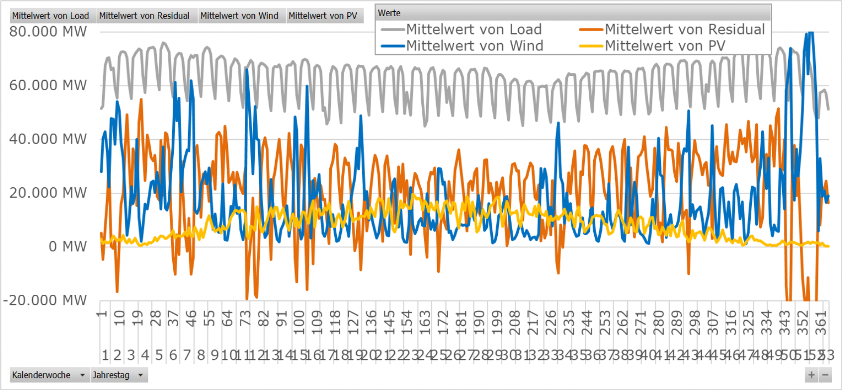 Assuming storage capacity for a whole week of consumption and averaging the figures for each week, reveals a remaining challenge of 40 GW residual load in winter times. The stong wind periods in the winter season