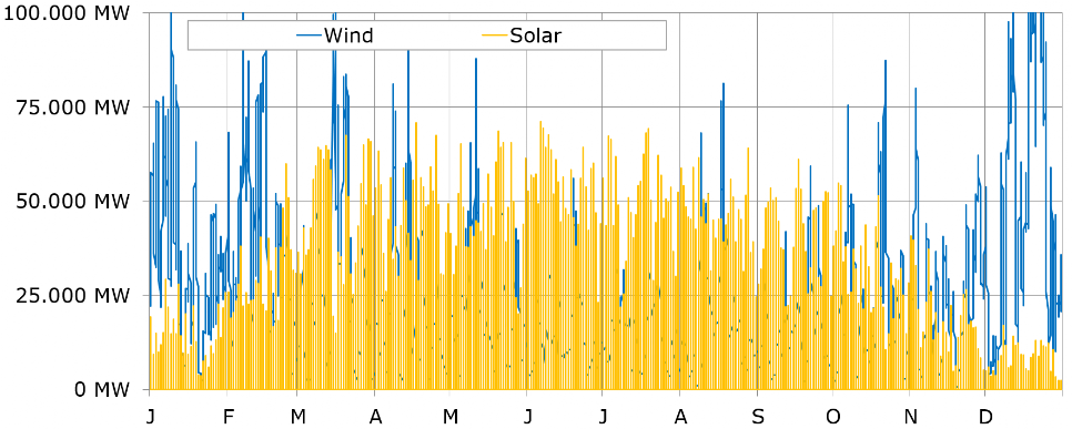 Wind and Solar Power Generation in Germany based on Weather Year 2015 extrapolated to the year 2030 with 65% renewable energies. In this chart PV is represented by the yellow line and wind by the blue line. It can be noticed that wind has its dominance in the winter season with peaks up to 100.000 MW while PV is much stronger during the summer time with peaks at 75.000 MW.