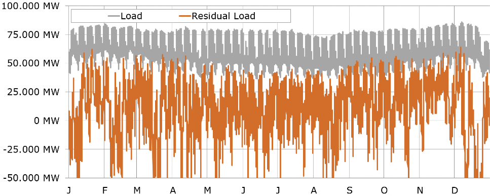 The red line represents the residual load after the Wind and PV generation is substracted from the load profile. This residual load needs to be filled by conventional power plants (including biomass and geothermal) or storage capacities.
