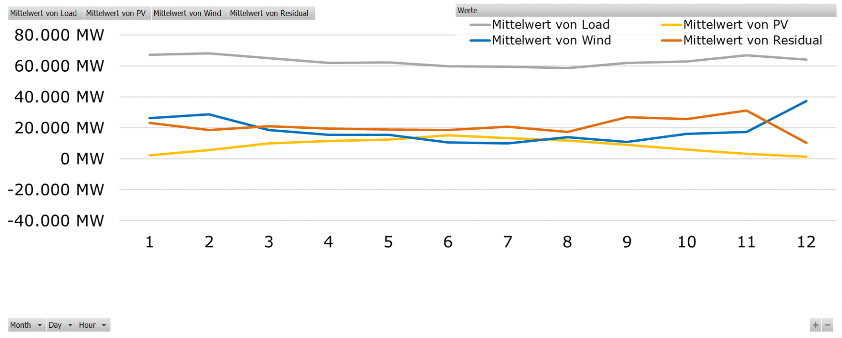 Moving from weeks to months reduces the variability in the different categories further. The peak for residual load diminishes to 30 GW. The combined generation of PV and Wind averages between 20 - 30 GW per month and is more stable than the individual contributions, especially as PV and Wind are complementary in its seasonality.