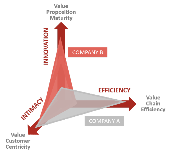 The illustration of Strategic Corporate Choices compares the positioning of two different companies on the three strategic axes. In this example, the x-axis refers to the value chain efficiency. The y-axis relates to innovation and shows the maturity of the value proposition. We analyze customer proximity on the z-axis, expressed as the value of customer orientation.
